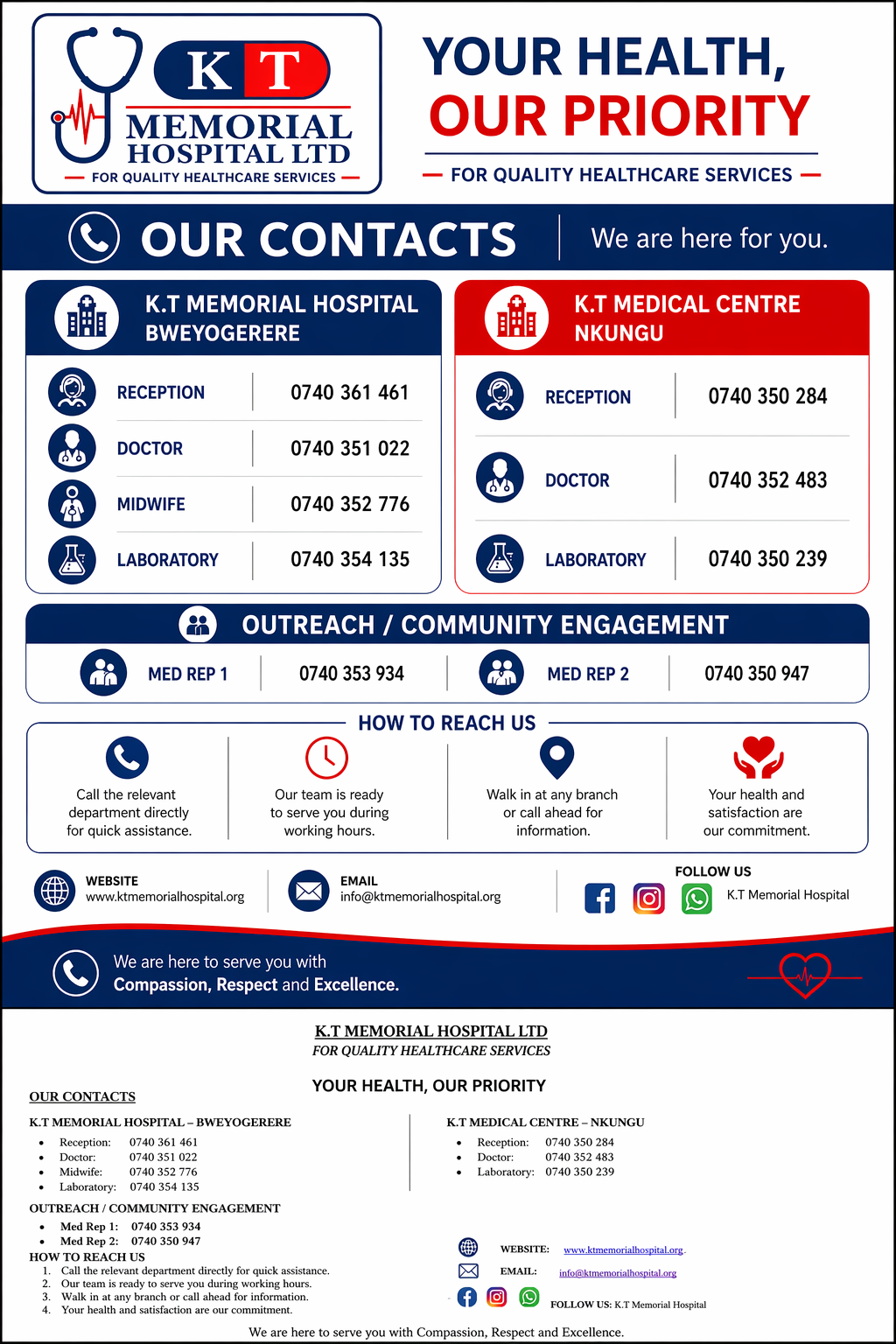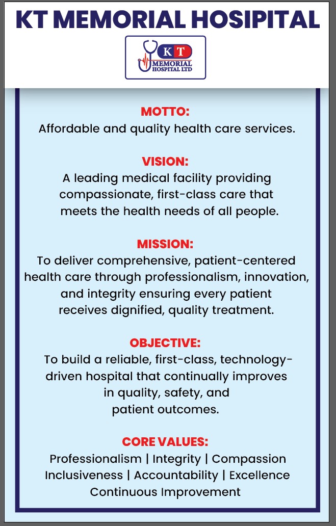 K.T Memorial Hospital Ltd (KTMH) has the vision of providing an establishment set on the principles of competence, commitment, compassion, convenience and effectiveness.